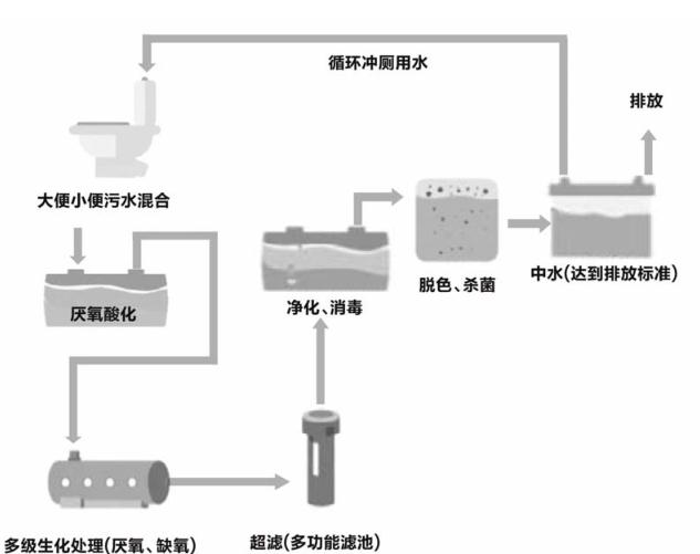 采用微生物技術(shù)和生化技術(shù),將大小便經(jīng)過(guò)厭氧、好氧等有機物反應,對有機物進(jìn)行分解消耗,再通膜過(guò)濾,消毒達到水質(zhì)凈化并實(shí)現持續循環(huán)使用。